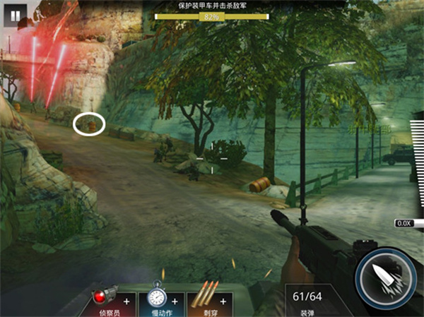 4、狙击手是很好辨识的,他们在寻找目标时,武器会有红色射线光。另外,如果地图中有油桶,图中画圈的部分,油桶爆炸可以炸死附近的士兵,在后面的其他任务也是如此。