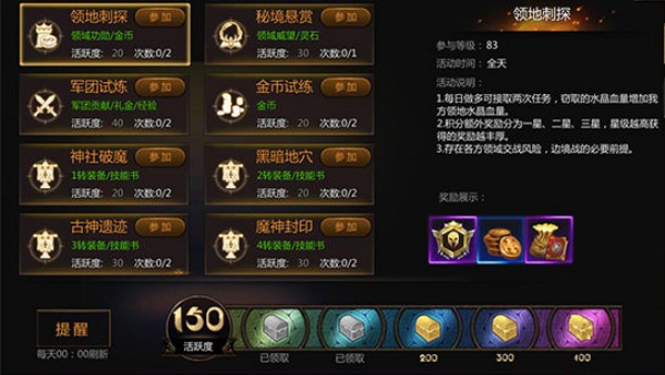 2、每日优先参与 “领地刺探” 活动,不仅能获取活跃值,还可通过完成刺探任务(每日最多接取两次),根据情报品质(一至三星)获得大量奖励,同时助力军团,是提升资源的重要途径。