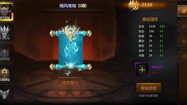 3、优先对高阶卷轴(如 10 阶飓风卷轴)进行 “卷轴领悟”,长按可快速领悟,能提升卷轴基础属性(生命、攻击等),增强战力,为后续战斗提供更有力支持。