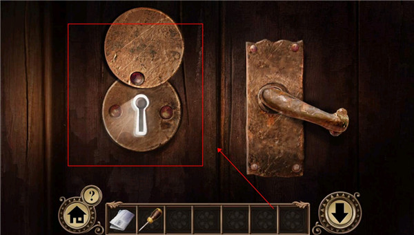 4、找到对应门锁形状的钥匙,用钥匙打开门上的锁,完成当前场景的解谜并推进流程。