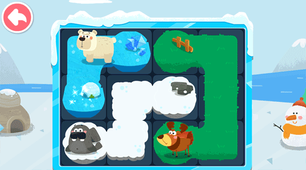 2、冰雪地图关卡中,观察方块布局,移动动物或道具至对应区域,解锁路径推进关卡。