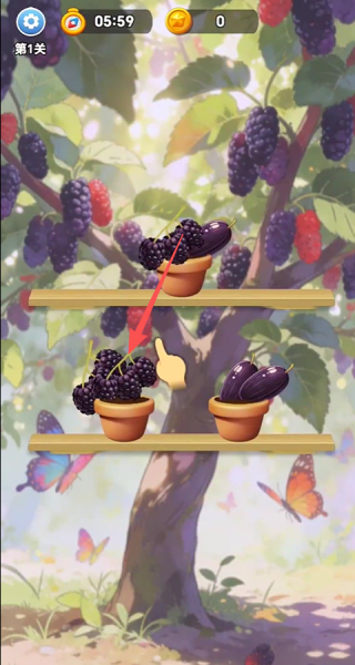 3、滑动指尖移动桑葚时要精准定位,避免多余操作,保证同类型桑葚能快速聚集,在轻松操作中体会收获的甜蜜。