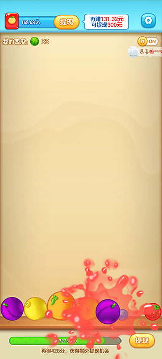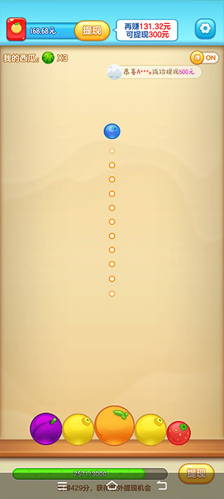 1、控制下落水果与底部同类元素精准对齐,通过连锁消除快速积累分数,达标即可解锁提现功能。