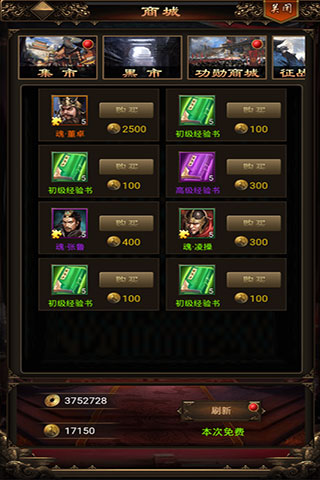 (3)功勋商店:前期优先兑换将魂合成关羽并培养,剩余功勋可购买经验书、材料包或前往名将阁兑换武将。