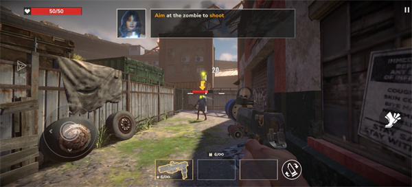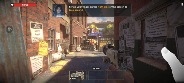 视角控制:依照引导滑动屏幕右侧来调整视角,时刻扫视周围环境,防止被背后偷袭的僵尸包围。