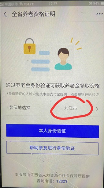 4、参保地选择“九江”, 本人认证直接点击“本人身份验证”, 帮亲友认证选择“帮助亲友进行身份验证”