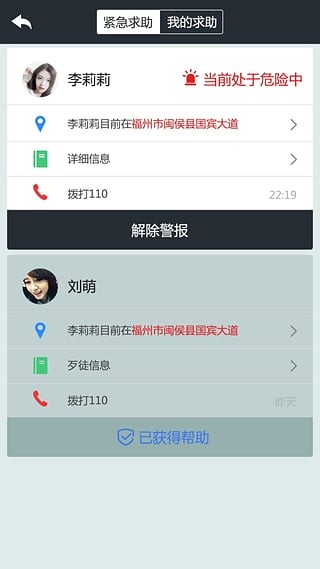 云服务器自动回拨电话,若用户无法接听或正确输入安全口令,云服务器马上启动救助模式,将相关信息推送到110报警平台、用户紧急联系人以及附近的其他用户,以实施营救或安全告警。