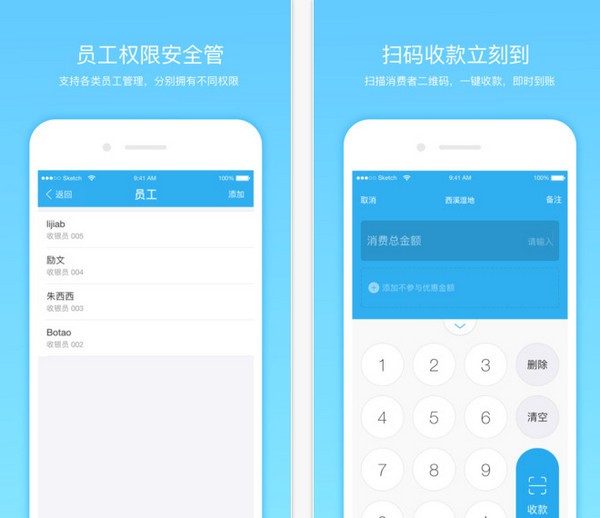 2.多员工管理,方便查看各员工的工作状态,且收款提供备注,方便好记。