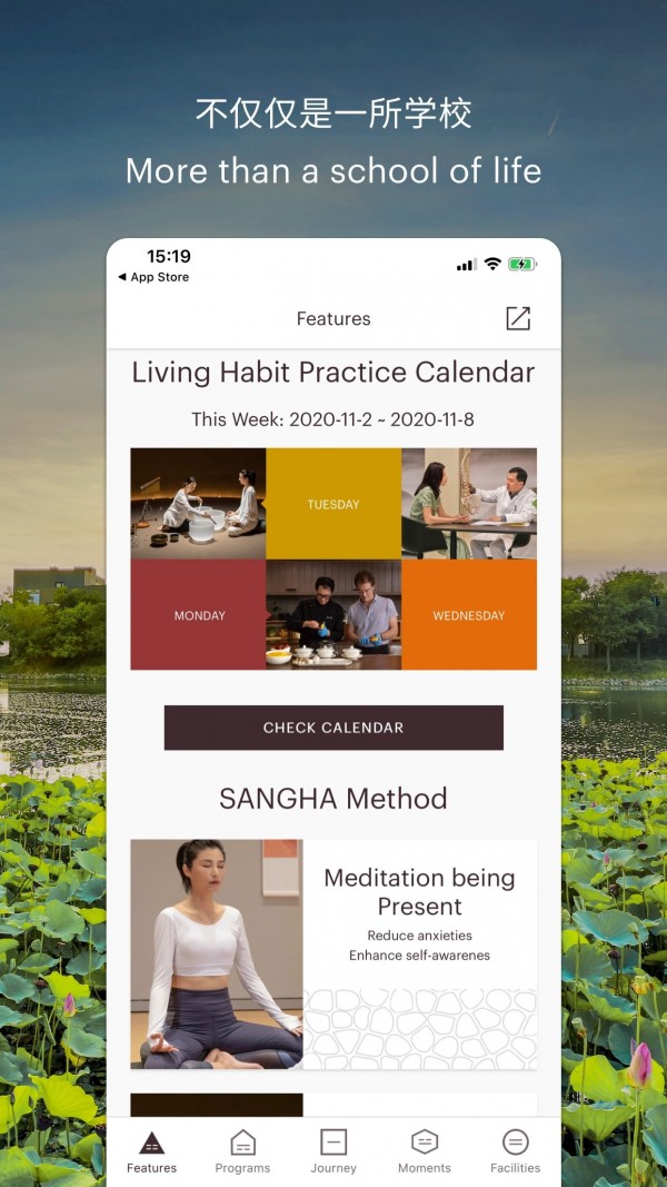 立刻下载水中天之旅APP,它将成为您静修学习之旅的好伙伴,在此您可以查看项目详情和行程,提前了解和熟悉音昱水中天的空间和设施,获取每周的生活习练课表,对音昱生活的理念和课程有更深入的了解. 我们期待着不久,在水中天与您相遇!