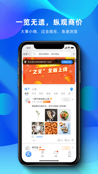 随时随地,查看附近商家优惠信息,美食、休闲、娱乐、购物,优惠信息一个不漏;