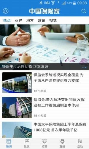 1.设置新闻、读报、数说、直播、活动五大板块,功能上包括提供第一手的保险新闻资讯