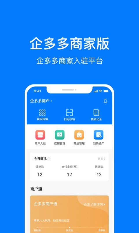 企多多商家版APP是入驻企多多的商家使用的管理软件,个性化操作页面,提供商家入驻、券码核销、消息管理、商品管理等服务,致力于为商家解决经营难题,提升经营效率。