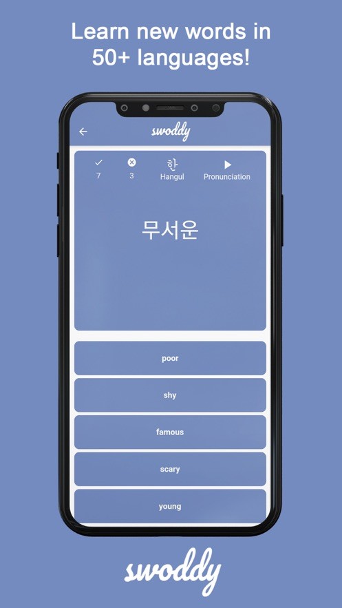 在练习模式中,你可以每天学习29种语言的新词汇。在Swoddy,我们有一个评分算法,使你专注于你通常给出错误答案的单词。我们为你提供每个单词的统计资料,这样你就可以看到哪些单词你很熟悉,哪些单词你需要多加练习。