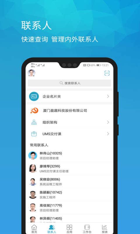 UMS uMobileAPP是为企业打造的掌上效率工作台。UMS uMobileAPP由厦门盈趣科技股份有限公司开发,覆盖所有工作流程,帮助内部员工高效工作。