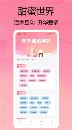柿橙泡泡是一款很多服务呈现,及时了解情话话术的本地服务软件,帮助一些社恐人员进行训练与提升,可以让个人社交实力不断增加,会结合不同的场景分享话术资源,及时去了解,人物关系不同,沟通也是完全不一样的,我们可以去这里及时参考,获取灵感,懂得如何和朋友开展沟通。