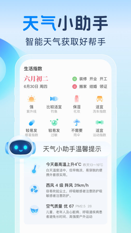 1、天气小助手,智能天气获取好帮手,大家可以在线一键查询最新的天气预报信息。