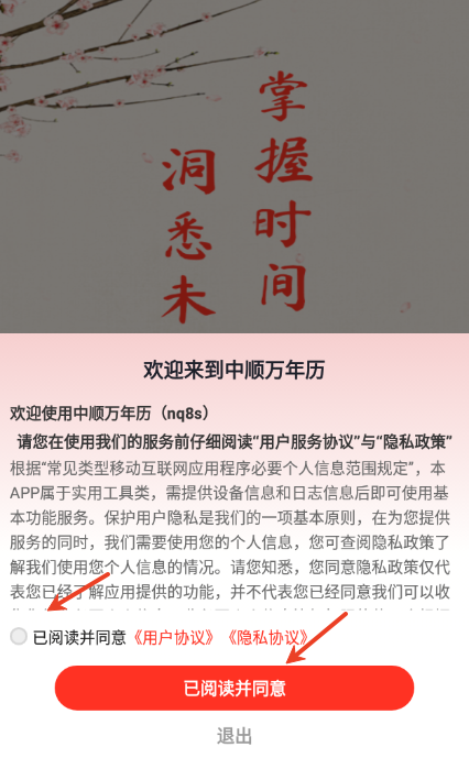 1、对万年历感兴趣的朋友,可以阅读同意并进入到首页之中;