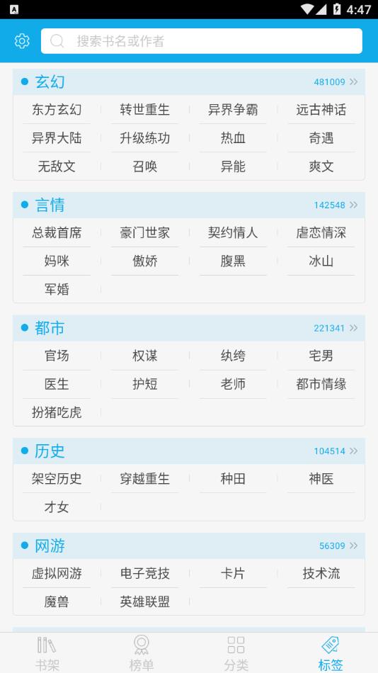 3、点击标签,通过各种标签去查找喜欢的小说。