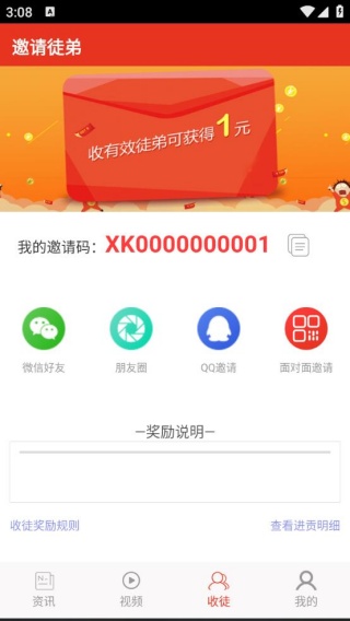 2、进入到收徒界面,有我的邀请码,分享邀请码给好友,让好友登录注册,就可以成功收徒。