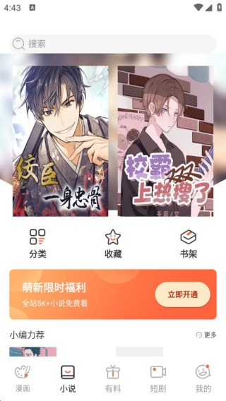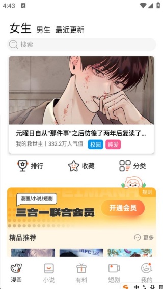 1、进入到平台去阅读喜欢的漫画,根据男生,女生,最近更新去查找,还有排行,收藏,分类去查看,精品推荐一键进入。