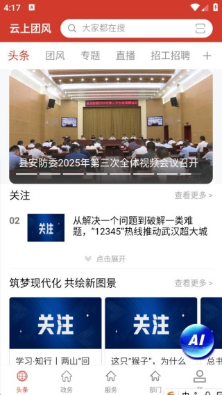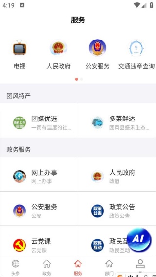 云上团风app是湖北长江云新媒体集团给团风县乡亲们做的移动政务软件。它集合了团风县各类新闻资讯、政务消息以及生活服务功能。能让大家轻松知晓本地服务,随时掌握民情动态。有超多新闻头条,还能发布政府民生信息,方便大家发声。软件操作简便,还有文化生活、电视、报料、云市场等生活服务,快来体验吧。