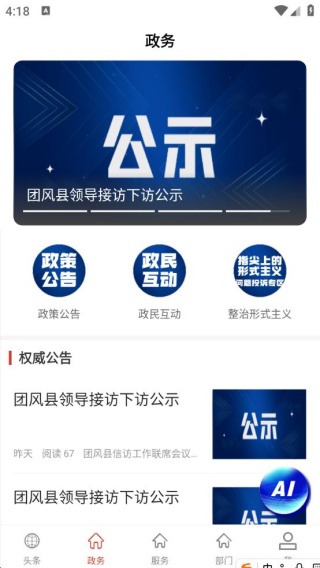 2、政务板块,有政策公告,政民互动,整治形式主义,权威公告直接点击阅读。