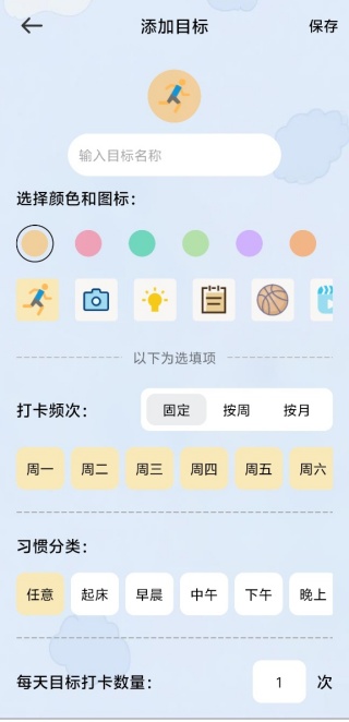 4、用户可以根据自己的需求,在App中设置每日、每周或每月的习惯目标,例如“每天早起”“每周运动三次”“每月读完一本书”等。