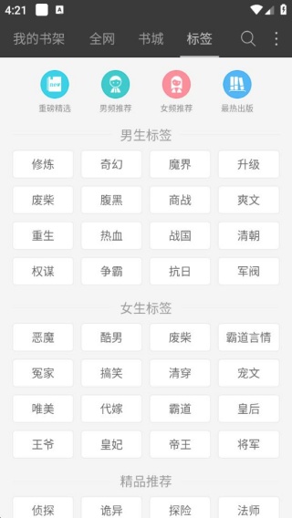 4、点击标签,有各种小说标签选择,大家看书选择多样,直接就可以进入阅读。