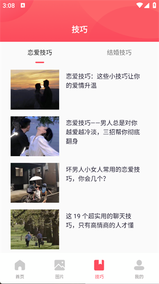4. 点击页面下方的‘技巧’,即可看到关于恋爱技巧和结婚技巧的文章,可以按需阅读。