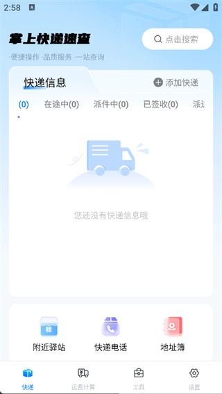 2. 在首页即可看到查询过的快递信息,还可以看到附近驿站、快递电话和地址簿等功能;