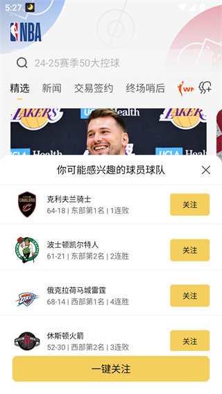 2、首次使用会推荐一些你感兴趣的球队,可以点击一键关注;