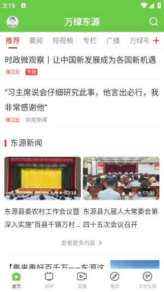 万绿东源可是咱东源地区超棒的综合信息发布平台哦!这里有超多本地新闻资讯,像党建、政务、民生、热点、论坛啥的都有。能给咱讲东源的好故事,传东源的好声音,就算不出门,也能发现最美东源。平台有电视、广播、直播、视频、图文等多样新闻,能按喜好选,还能搜索找新闻,定制专属阅读。看直播新闻能不出门直达现场,记者实时转播。“服务”专栏有火车查询、东源天气、违章查询等特色服务,赶紧下载万绿东源app用起来!