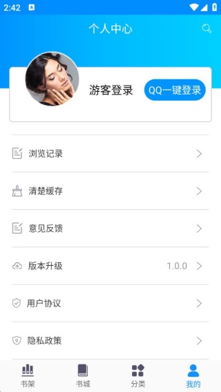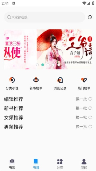 1、下载安装软件后打开,进入到平台书城,有分类小说,新书榜单,浏览记录等去进行点击操作。