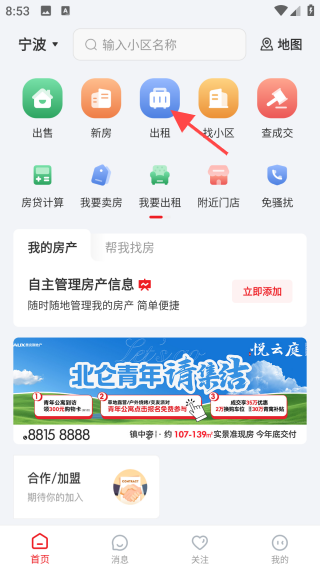 2、进入首页,点击【出租】图标,也可浏览“出租房源”信息。