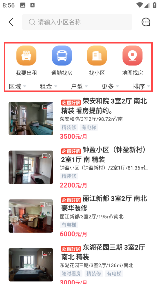 3、设置区域、租金等筛选条件,或使用通勤找房、找小区等功能。
