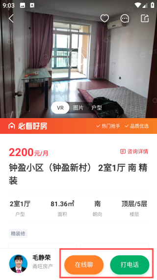 4、查看心仪房源信息,选择【在线聊】或【打电话】沟通,也可预约看房。