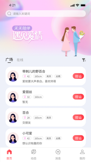 1、下载安装app之后即可进入首页,可以看到广场很多的单身小伙伴;