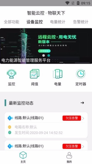 1、可以看到首页全部功能,还可以进行设备监控、电量统计、警告统计;