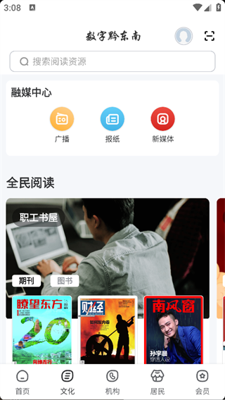 3. 点击页面下方的‘文化’,即可看到融媒中心和全面阅读功能;