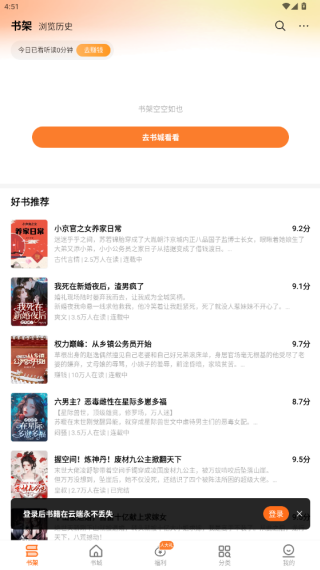 3、这里可以打开书架,可以看看自己收藏的小说;