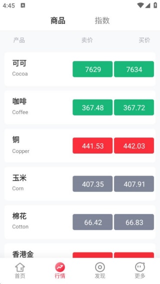 2、可以通过点击行情,及时获取各种不同商品的卖价买价;
