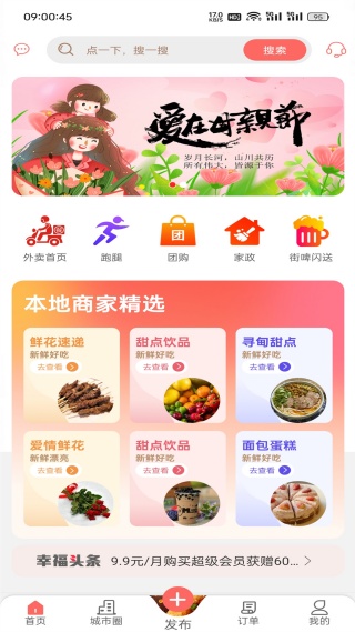 1、下载安装app,进入首页,可以看到外卖、团购、跑腿服务;