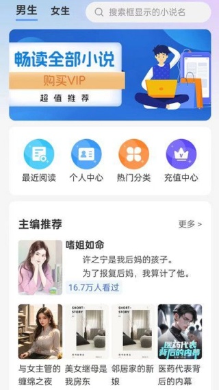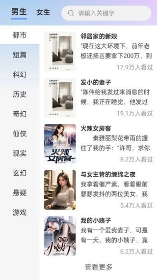 2、进入首页,可以看到男生和女生不同的小说类型;