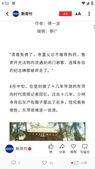 4、支持将喜欢的文章快速发送到其他平台与好友共同分享;