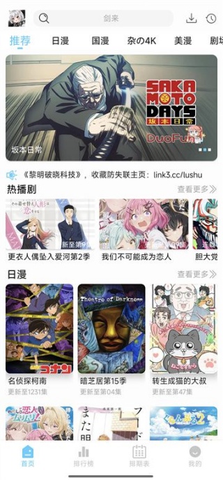 2、首页划分推荐、日漫、国漫、美漫等板块,同时支持关键词搜索,帮助用户快速定位目标动漫。