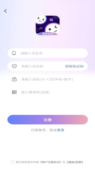 1、打开APP后,点击“注册”,填写手机号验、验证码完成注册。