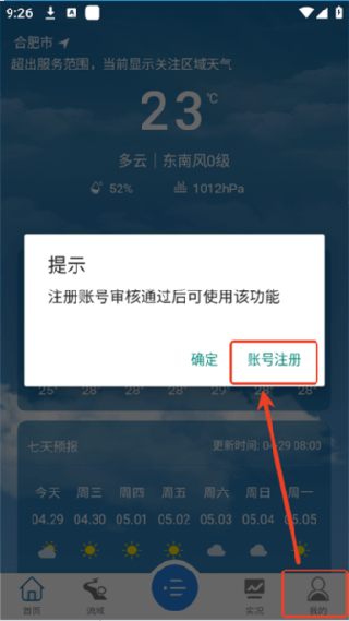 2. 鉴于大部分功能需登录账号并经审核,所以首先点击【我的】,在弹出窗口中点选“账号注册”。
