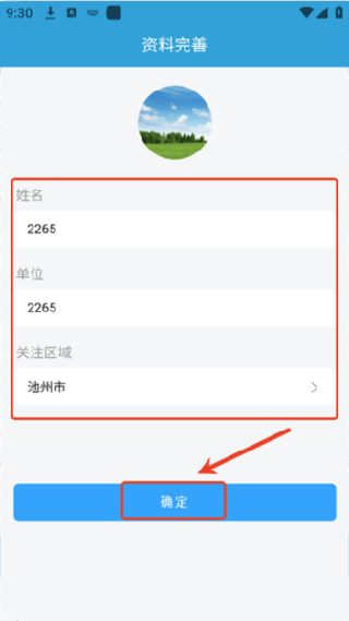 4. 完成姓名、单位的设置,选择关注区域后点击“确定”。