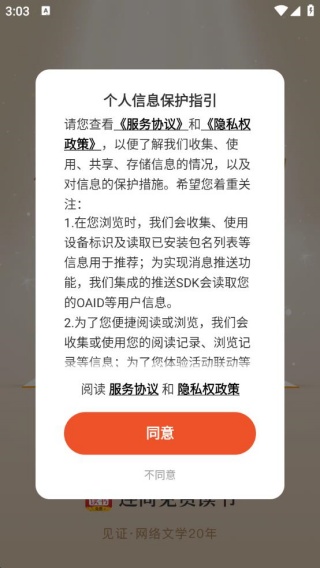 1、下载安装软件后打开,弹出个人信息保护指引,阅读后,点击同意。