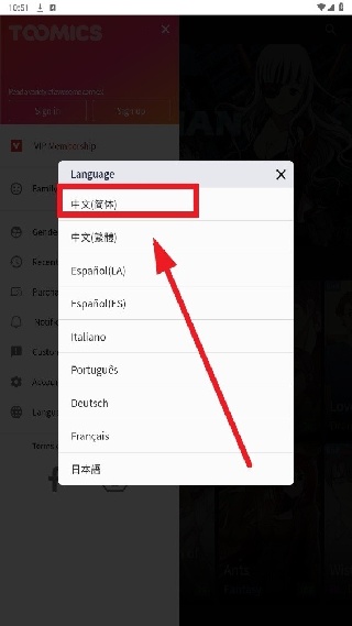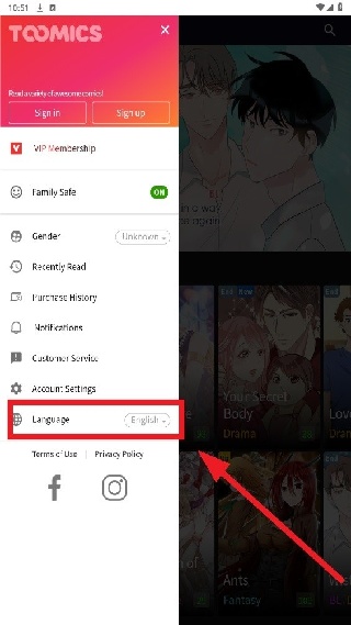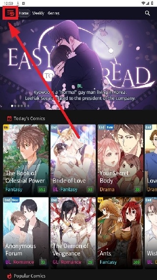 1. 打开Toomics应用后,点击左上角home旁的图标。